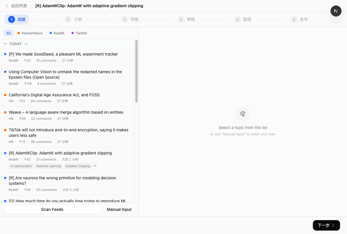 自动追踪全网热点(HackerNews / Reddit / Twitter),AI 评分筛选高潜力选题